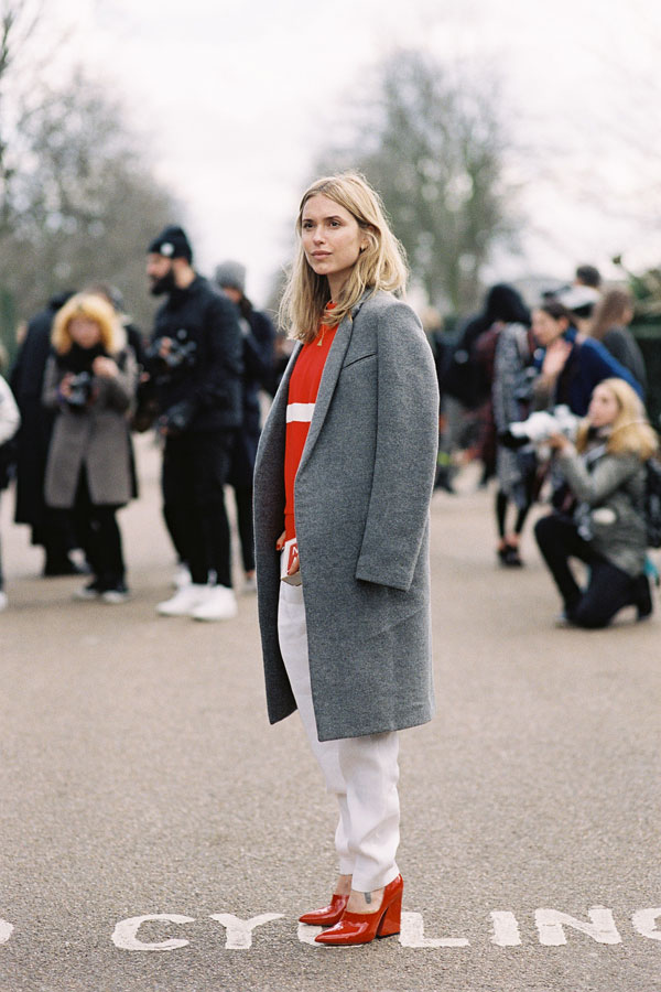 Stylist Pernille Theisbaek of Look De Pernille, after Burberry, London, February 2015. Winter white with a lovely dash of red and grey. Recreate Pernille's look (kind of): Grey coat: McQ Alexander McQueen oversized coat, Acne Studios Melton Elsa coat, J.Crew Stadium cloth cocoon coat, Calvin Klein Collection wool and cashmere blend coat, Topshop slim pocket coat, Rag & Bone Singer Bemberg coat, Milly Claudia Oversized bonded wool coat, or Weekend Max Mara Urna coatWhite trousers: 3.1 Phillip Lim stretch cotton twill wide-leg pants, Michael Kors Crepe straight leg pants, Protagonist Twill tuxedo trousers, or J.Crew Collection wide leg trouser